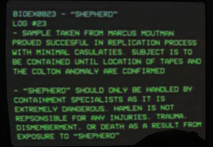 To maintain control of Rebecca and weaken her link with the Anomaly, Hameln created Shepherd in late 2003, a trainable facsimile of the Anoamly that was designed to destroy the Amanda the Adventurer tapes.[3] For a period of time, Hameln could not confirm the location of the Anomaly and the tapes.[4]